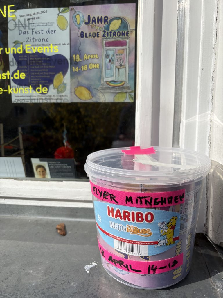 Heute sind die Flyer angekommen: 18.April Tag der BlauenZitrone. Alle sind herzlich eingeladen, mit uns den ersten Geburtstag zu feiern. Von 14 – 18 Uhr mit verschiedenen Kunstworkshops, Aktionen, Live-Musik und vielem mehr. Nehmt die Flyer aus der Boy mit uns gebt sie Freunden und Verwandten!